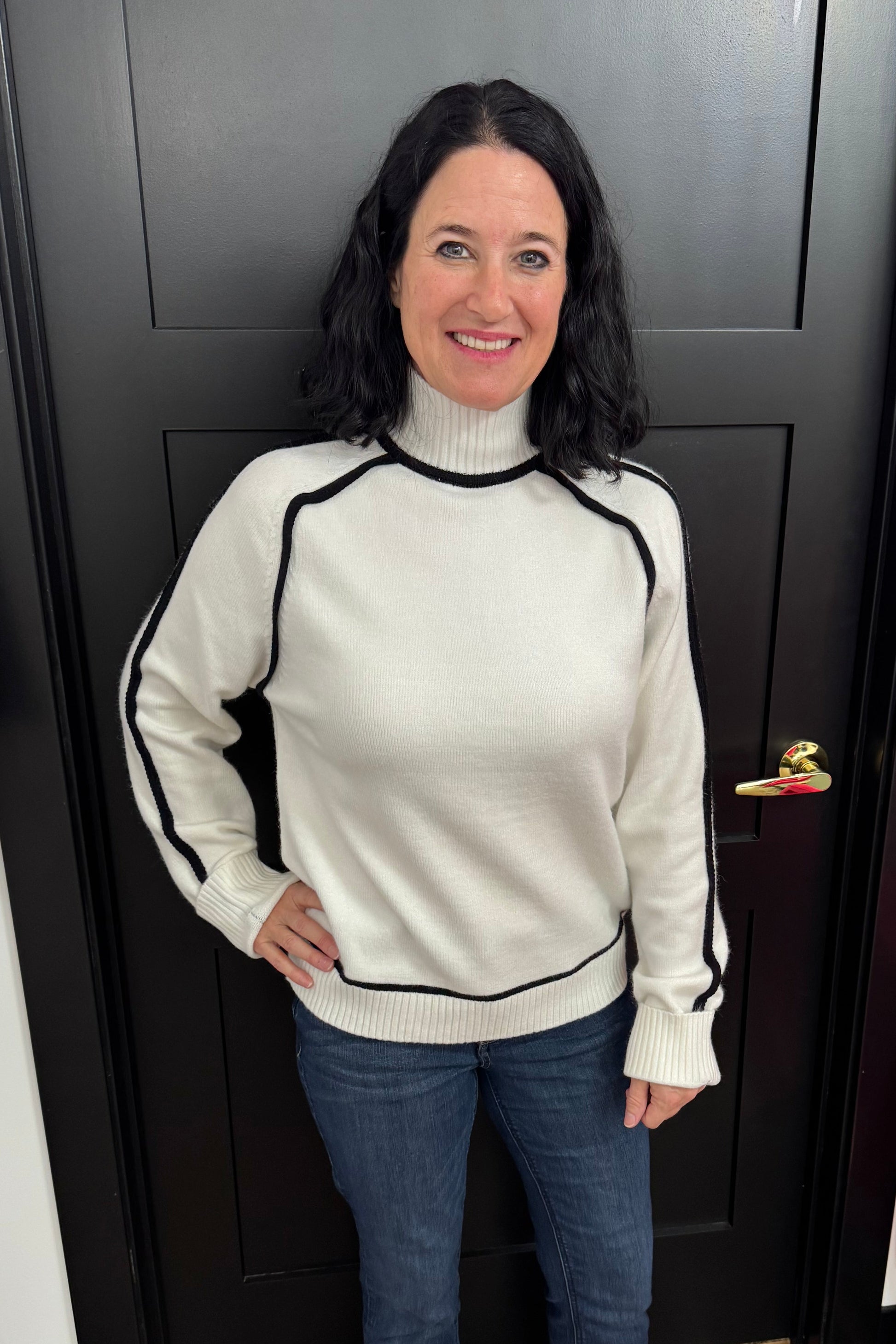 Elevate your everyday wardrobe with this sophisticated turtle neck sweater, featuring a crisp white base accented by sleek black piping. Crafted from luxuriously soft fabric, it delivers comfort without compromise. Perfect for layering or wearing solo, this versatile piece transitions seamlessly from casual to polished looks. A timeless essential that works harder than it looks.