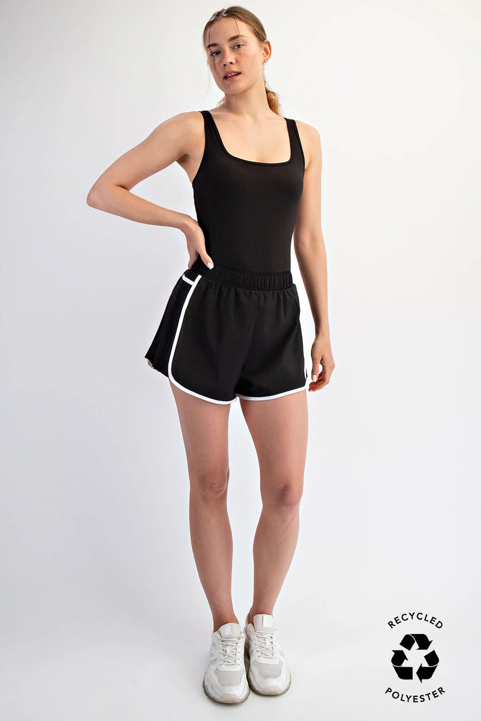 Move effortlessly in this stylish shortsie, made from recycled butter soft fabric with lightweight stretch woven fabric. Featuring a sleek onesie design, pleated pant details, and bold color contrast accents, it's perfect for any active lifestyle.